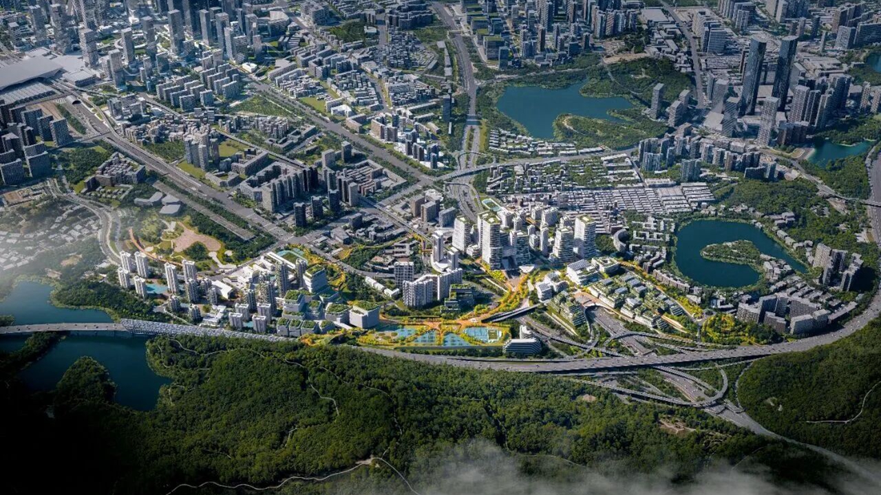 A computer-generated aerial view of the Meilin Checkpoint highlights the district’s integration of transport infrastructure with residential, commercial, and ecological spaces in the future. Photos from WeChat account "一眼龙华"