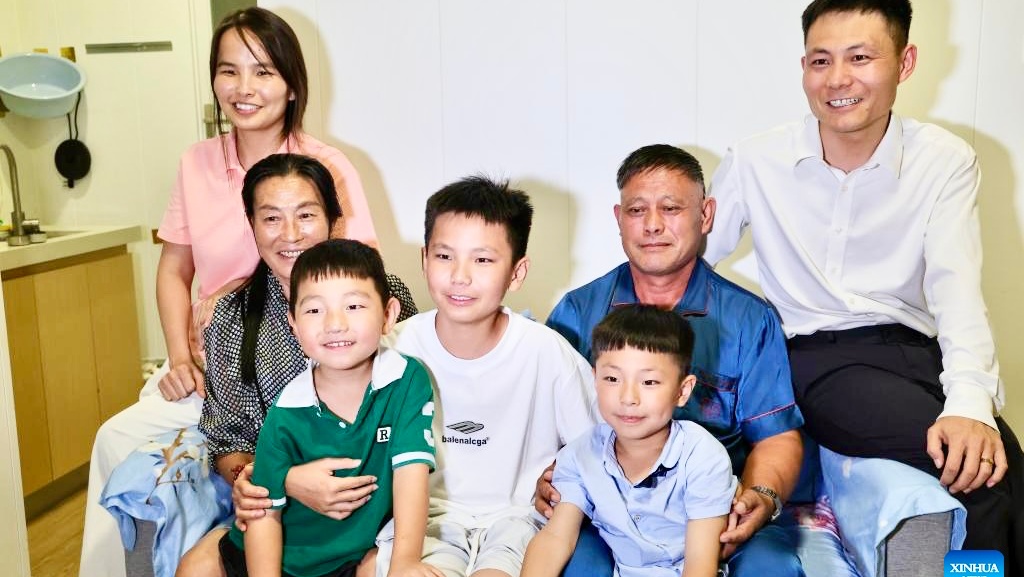 Zou Meng (L), a courier, watches a cartoon with his wife and daughter in Bao'an District, Shenzhen, south China's Guangdong Province, Aug. 19, 2025.Expensive rent and substandard housing arrangements have made it difficult for workers from other places to reunite with their family in Shenzhen. In order to solve the difficulties faced by them, Shenzhen launched a reunion apartment project for four kinds of groups, including tr