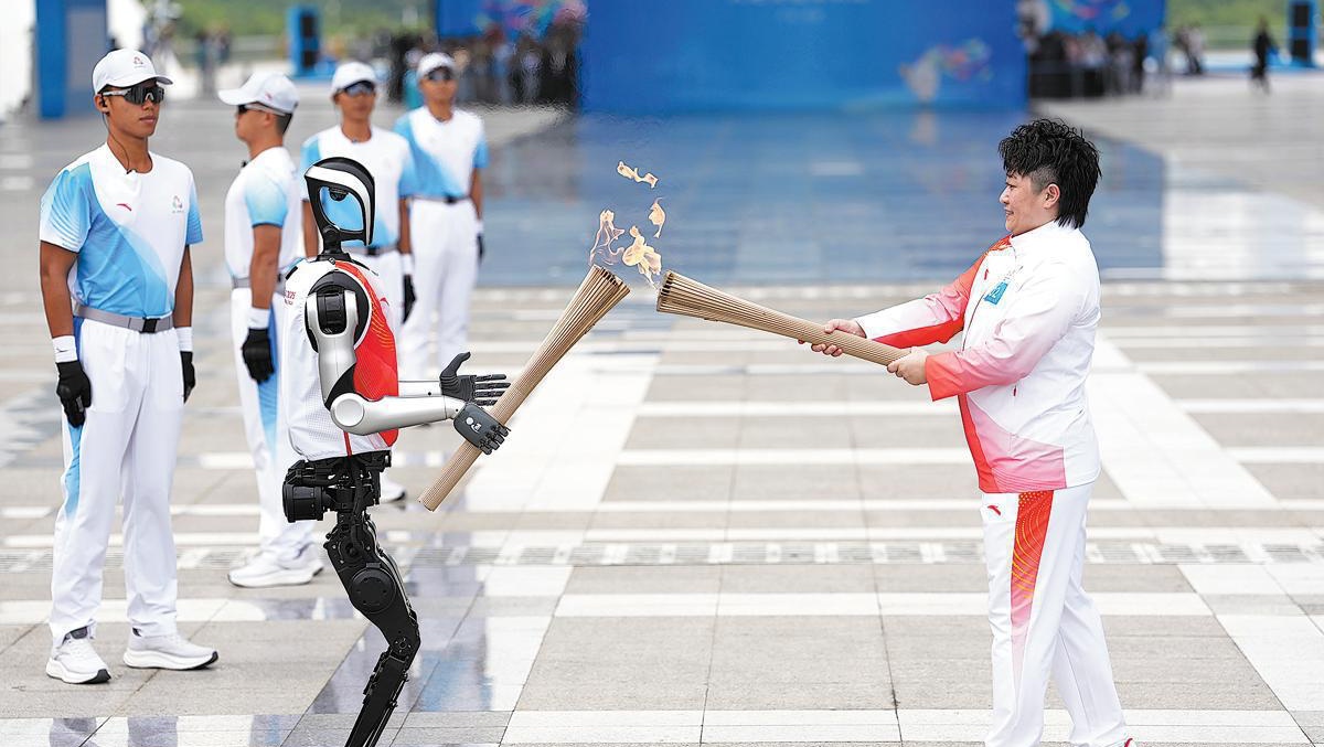 Yu Yang, an Olympic badminton gold medalist, ignites her torch from one held by humanoid robot Kuavo on November 3th during the torch relay held in Shenzhen, Guangdong province, for the 15th National Games. The 15th National Games will officially open in Guangzhou, capital of Guangdong province, on November 9. Besides the 419 gold medals in 34 competition events for professional athletes, 166 gold medals will be on offer for the