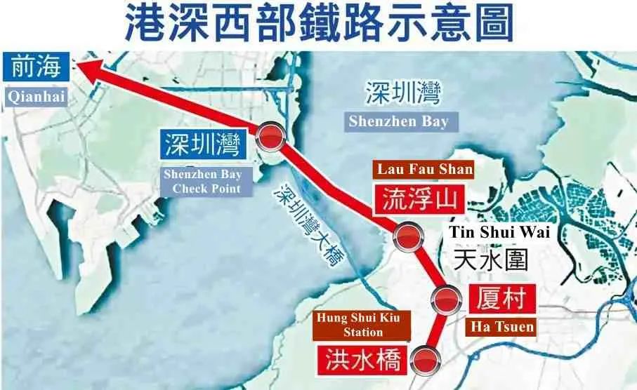 The proposed Hong Kong-Shenzhen Western Rail Link — of which an 8-km section will pass through Hong Kong — will begin at the Hung Shui Kiu Station on the Tuen Ma Line. It will pass through Ha Tsuen and Lau Fau Shan, cross the Deep Bay, and connect to Qianhai via the Shenzhen Bay Checkpoint. The railway line aims to connect Hong Kong’s Northern Metropolis and the Guangzhou-Shenzhen innovation and technology corridor. It is scheduled to be completed between 2034 and 2038.