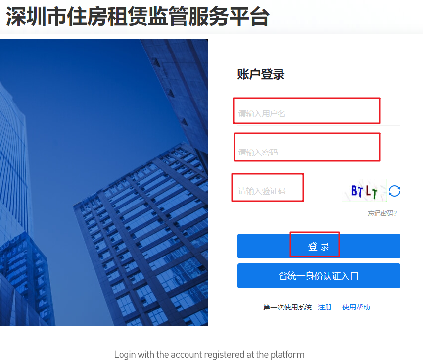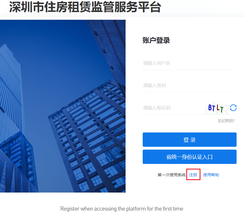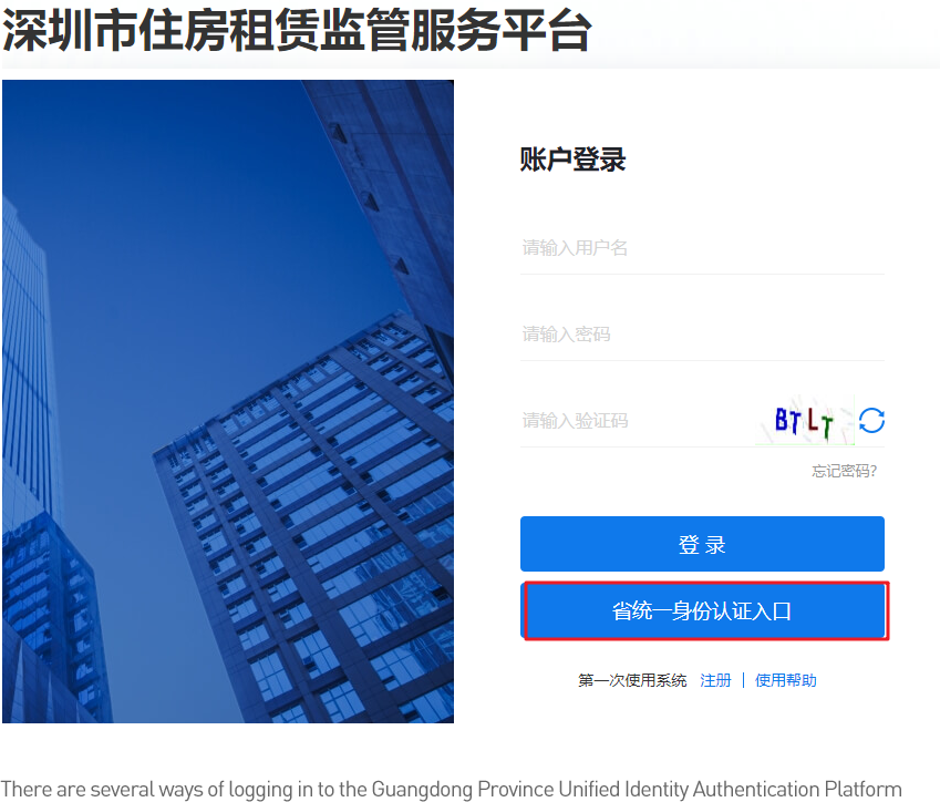 When using the Shenzhen Housing Rental Supervision Service Platform for the first time, you are required to register or directly log in your account of the Guangdong Province Unified Identity Authentication Platform.