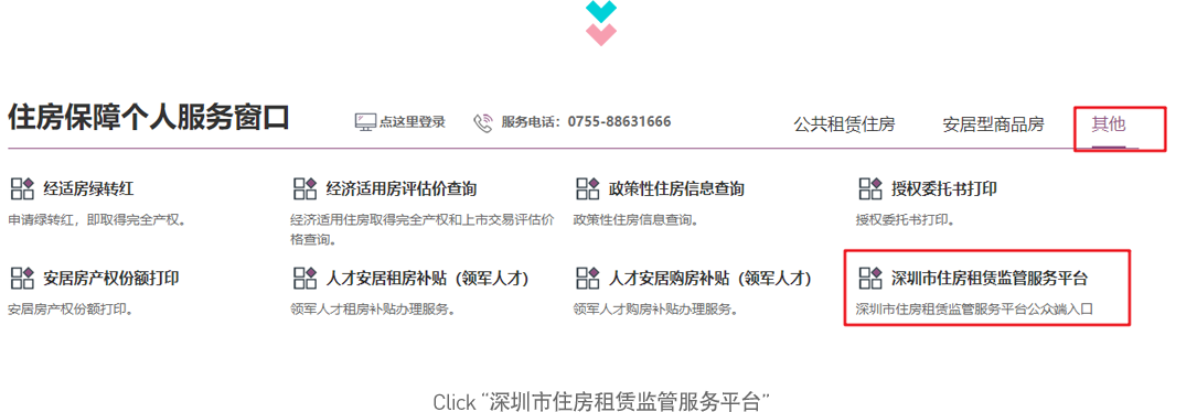 Open the official website of the Housing and Construction Bureau of Shenzhen Municipality (//zjj.tanhuaxl.net/) and follow the instructions: “主页 ” > “住房保障服务” > “住房保障个人服务窗口”> “其他”> “深圳住房租赁监管服务平台.”