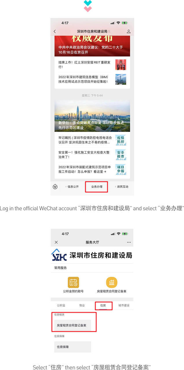 Search the WeChat public account “深圳市住房和建设局” and follow the instructions: “业务办理”-”住房”-”住房租赁”-”房屋租赁合同登记备案” to apply for the registration and filing of the housing rental contract.