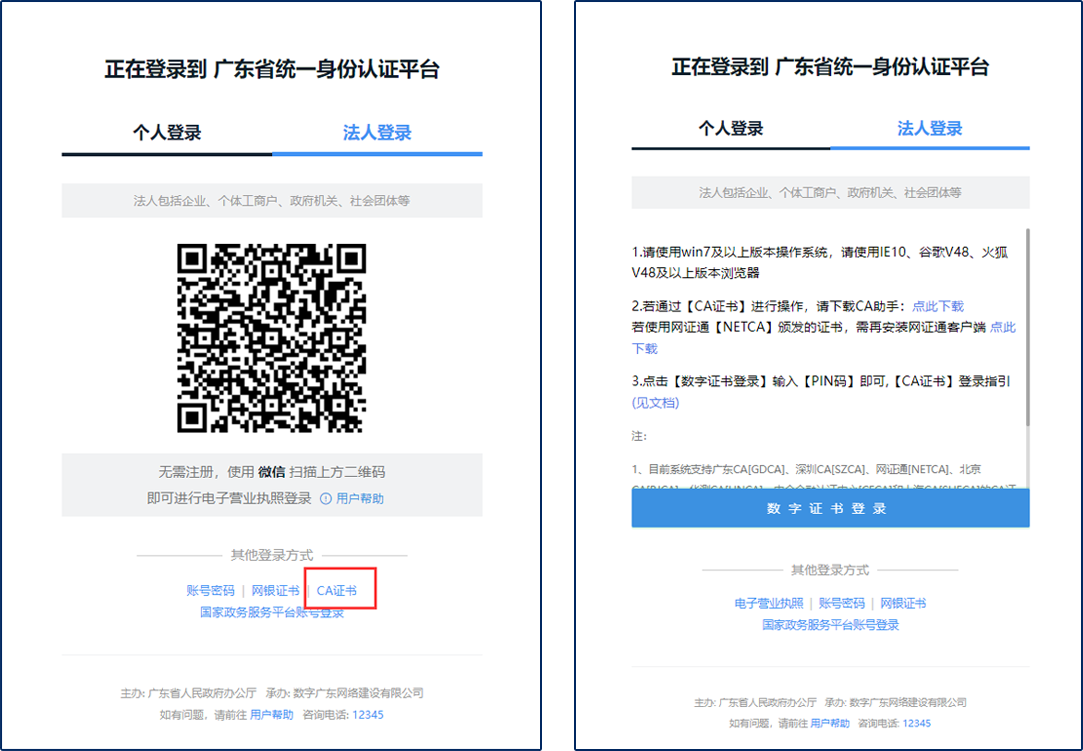 Available for individual users and legal persons. The system currently supports CA certificates of Guangdong, Shenzhen, NET, Beijing and HNCA, which requires the CA assistant.