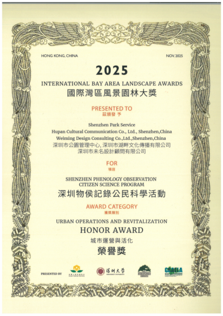 由深圳市城市管理和综合执法局指导,深圳市公园管理中心主办,深圳市湖畔文化传播有限公司承办的“深圳物候记录公民科学活动”项目,在“2025国际湾区风景园林大奖——城市运营与活化”类别中获荣誉奖,成为该类别唯一获奖项目。
