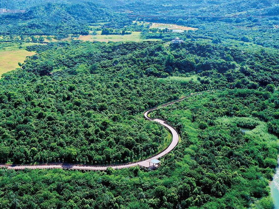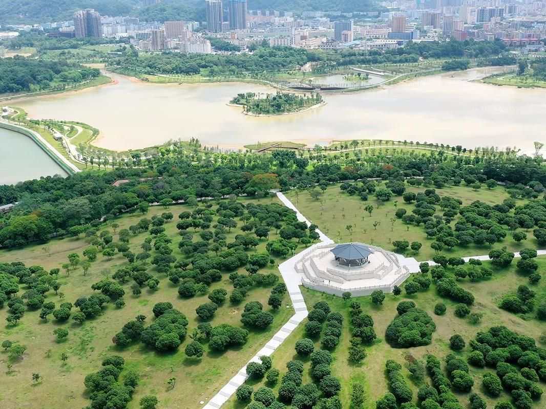 “俯仰之间”公园:山顶大凉亭可同时容纳200人,实现“仰,可看阿婆髻山青翠欲滴;俯,可观石岩湖清澈如镜”,共揽湖光山色。