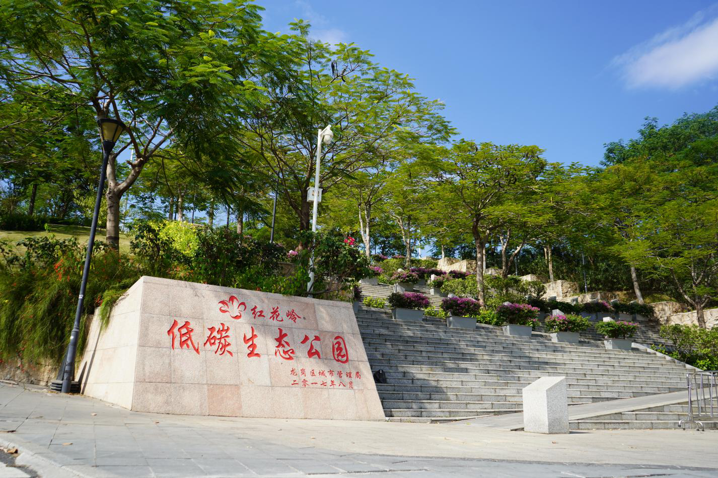 龙岗区红花岭低碳生态公园占地面积65万平方米,位于深圳市龙岗区龙岗、龙城和坪地三个街道的交界处,龙岗中心城东北部,北侧紧邻红花岭采石场,东南侧紧邻龙环大道。由新生水库、田祖上水库及周边陆域组成。公园以自然山林景观为主,全园设有红花广场、环湖绿道、临翠登山道、观景塔、山韵广场、听风台、观谷台、栖霞廊、花溪童趣、低碳生态郊野径、红花岭自然教育中心、翠微径第四段、静远营地、翠微驿站、临翠山驿站、环翠山驿站,其中主入口停车场有150余辆停车位。游客服务中心1个,景观塔1座。公园设计中利用LID低影响开发技术,实现城市雨水收集利用的生态技术体系,贯彻生态环保的海绵城市的建设理念。
