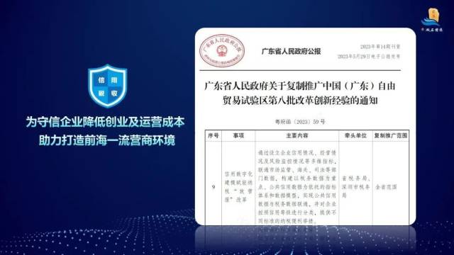 前海税务局还创新了“信用+托管”“信用+优惠认定”“信用+文书送达”“信用+司法执行”“信用+融资”等多部门联合激励应用场景,使信用建设成为社会治理重要组成部分。以“信用+司法执行”为例,前海法院依托“信用税收”项目制定保障前海蛇口自贸片区诚信建设指引,对信用等级较高且无不良司法记录的企业采取更灵活更温和的执行措施,保障企业正常经营。目前“信用税收”项目协助前海法院办结诚信企业案件573件,涉及诚信企业119家,结案标的额达6.07亿元。