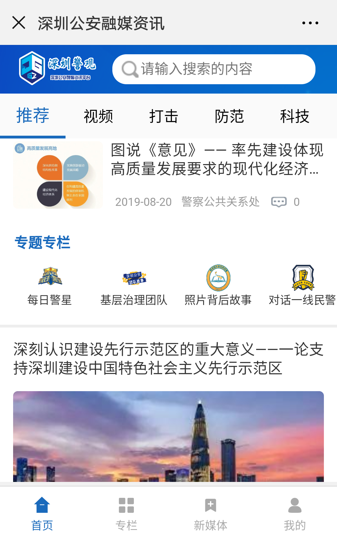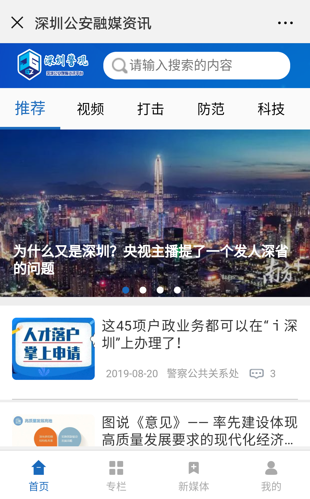 2019年8月21日,深圳公安融媒体资讯平台“深圳警观”2.0上线,以更加新颖活泼的版面设计、更加丰富精准的警务资讯内容、更加贴心的互动服务引领政务融媒体平台建设,深圳公安“中央厨房式”融媒资讯平台全新升级。