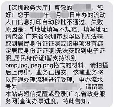 对驳回事项短信告知原因:对秒批不通过事项,会有短信提示发到申请人手机上,一次性明确告知申办人事项无法秒批成功的原因,并同步转人工审批。