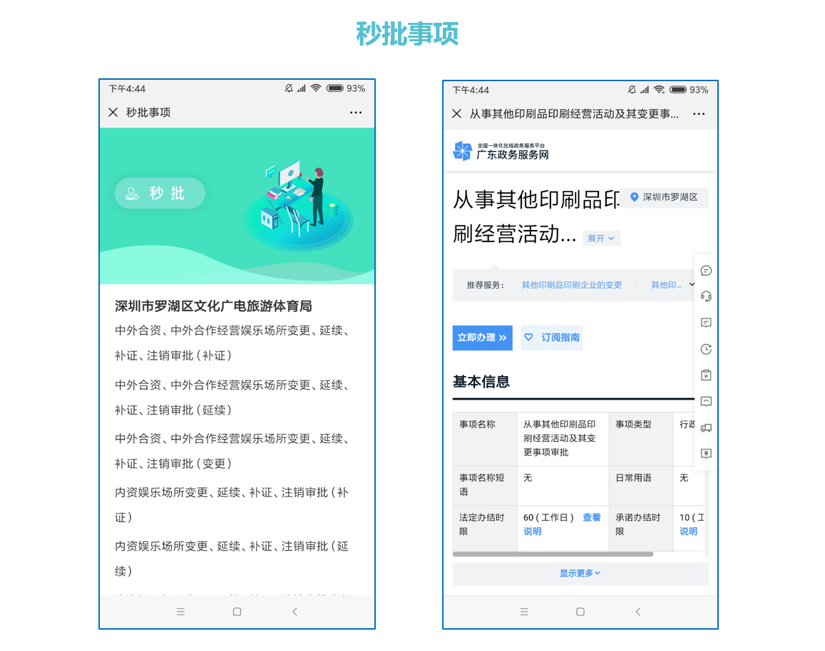 (三)提供掌上业务秒批办理服务。“秒批”是通过变革政府审批模式,对业务流程进行重塑和再造,实现全过程无人工干预的自动化审批。“i罗湖”积极打通部门间数据壁垒,开发掌上业务“秒批”应用。截至11月18日,罗湖区已实现104项业务可“秒批”办理,办事群众通过线上申请、系统自动审批,足不出户即可完成业务办理,极大提升了群众办事的获得感。