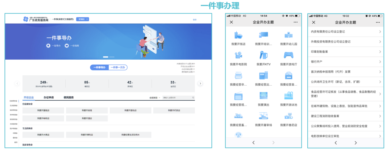 (四)“一件事一次办”掌上联动办理,提供“场景化”服务。聚焦高频业务,打通相关业务数据节点,整合优化办事流程,提供主题式套餐式服务,将多部门事项办理整合为“一件事”办理。对属于同一个主题的事项,用户可通过“i罗湖”专题模块找到开办流程图以及所需办理的各类事项集合,不再需要逐个事项分开查找,实现“一件事”场景式主题服务。目前,“i罗湖”已梳理出开饭店、开培训机构、开幼儿园等42个企业开办主题的场景式导办服务,让群众和企业办事“少填、少报、少跑、快办”。