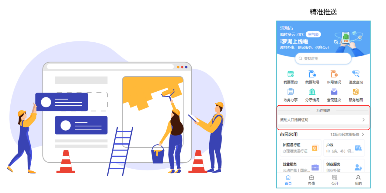 (五)提供智能精准推送服务。通过重点数据的采集和应用分析,打造个性化掌上政务新模式,实现个人、法人的全生命周期管理。为群众主动推送智能化、精准化、个性化的公开和服务。目前,罗湖区作为深圳市唯一的精准推送项目试点区,通过“i罗湖”平台已精准推送近2万条信息。