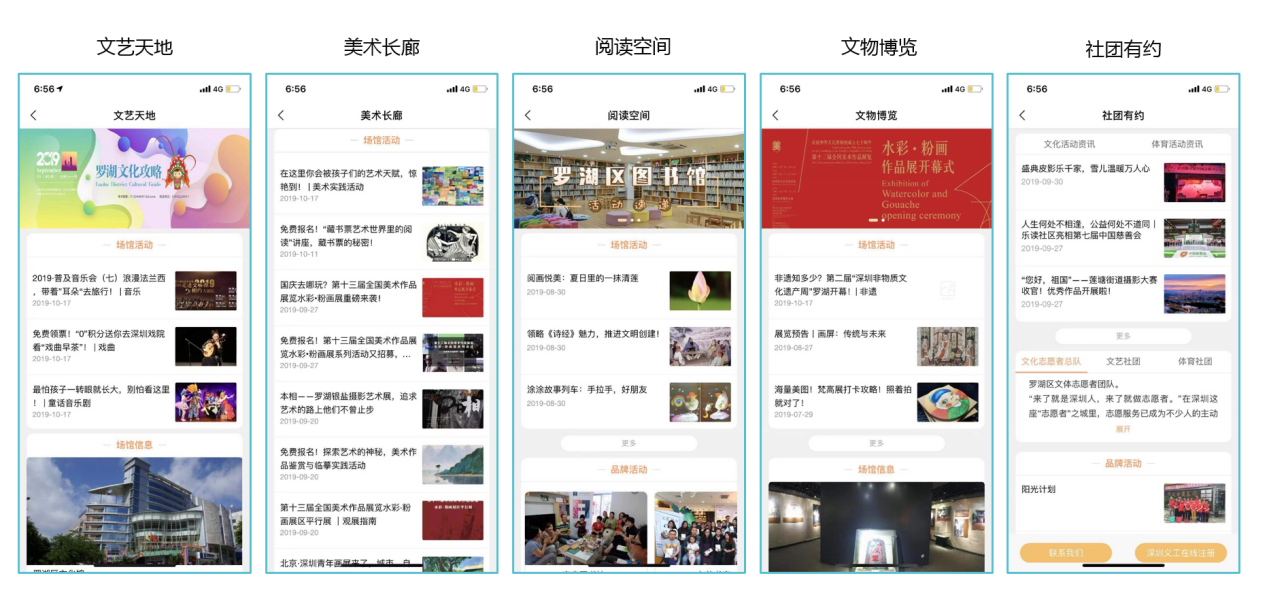 (三)文体方面,“i罗湖”让文体生活更丰富。一是丰富青少年课余文化生活。“i罗湖”集罗湖区青少年课余文化生活所需,通过课程发布、在线报名、在线支付、考勤点名、随身课表等功能为罗湖青少年提供课余文化生活的兴趣补充。二是提供掌上图书借阅渠道。“i罗湖”的罗湖图书馆专区,实现线上查看馆藏书籍并发起借阅,线下取书、还书,完成借阅全过程。三是汇聚文体信息。通过文艺天地、美术长廊、阅读空间、文物博览、社团有约等服务应用,为罗湖市民提供更多文体方面的信息。