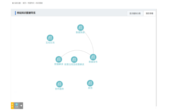 “网站知识图谱导览”的作用是紧扣群众和企业的不同需求,从实际运用场景出发,精准打造的多种类应用服务。深度串联用户意图,结合图谱探索,给出更准确的答案,其目的是为了达到一站式服务到底。
