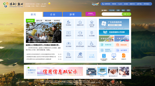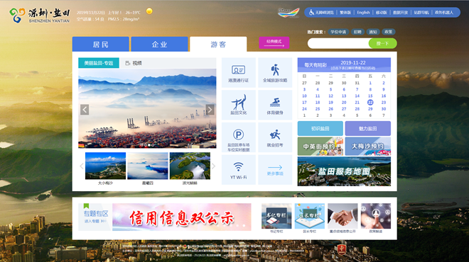 盐田区坚持以人民为中心的发展思想,秉持主动服务的理念,充分利用现代信息技术与大数据分析技术,对“深圳盐田政府在线”门户网站进行全面转型升级,针对居民、企业和游客三类人群,定制个性化页面,打破传统网站模式,融入特色服务、文体旅游、企业服务等内容,推出经典版、角色版双网页。适应国际化城区建设和粤港澳大湾区发展趋势,开通建设英文版网站,探索主动为辖区外籍及港澳人士提供服务,全方位打造智慧型门户网站,领跑主动服务的新型网上政府。