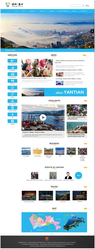 为推进国际化城区建设,进一步优化营商环境,不断完善政务信息公开和政务涉外服务,开通建设英文版网站,充分考虑外籍及港澳受众的信息需求和阅读习惯,设置“盐田区政府(GOVERNMENT)、盐田新闻(NEWS)、盐田亮点(HIGHLIGHTS)、涉外服务(SERVICES)、投资盐田(BUSINESS)、来盐旅游(TRAVEL)、互动交流(CONTACT US)、外国人在盐田(EXPATS IN YANTIAN)、盐田地图(MAP)”等9个一级栏目,30个二级栏目,集资讯、招商、对外交流、生活服务等功能于一体,旨在打造符合国际标准、彰显盐田特色的英文版门户网站,为外籍及港澳人士提供盐田资讯等方面的优质服务。