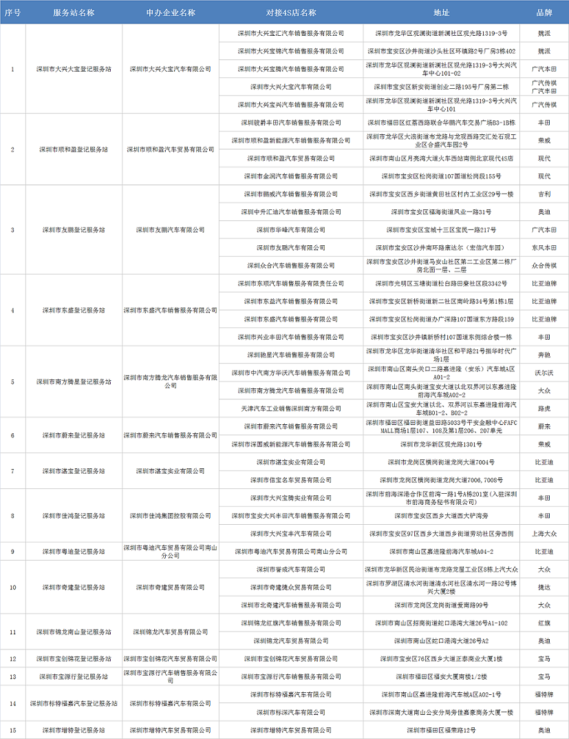 深圳市交管部门选定15家新车登记服务站、5家二手车登记服务站为第一批快捷代办登记试点,各试点可以备案多家没有服务站的4S店(需将资料交至车管所备案)。