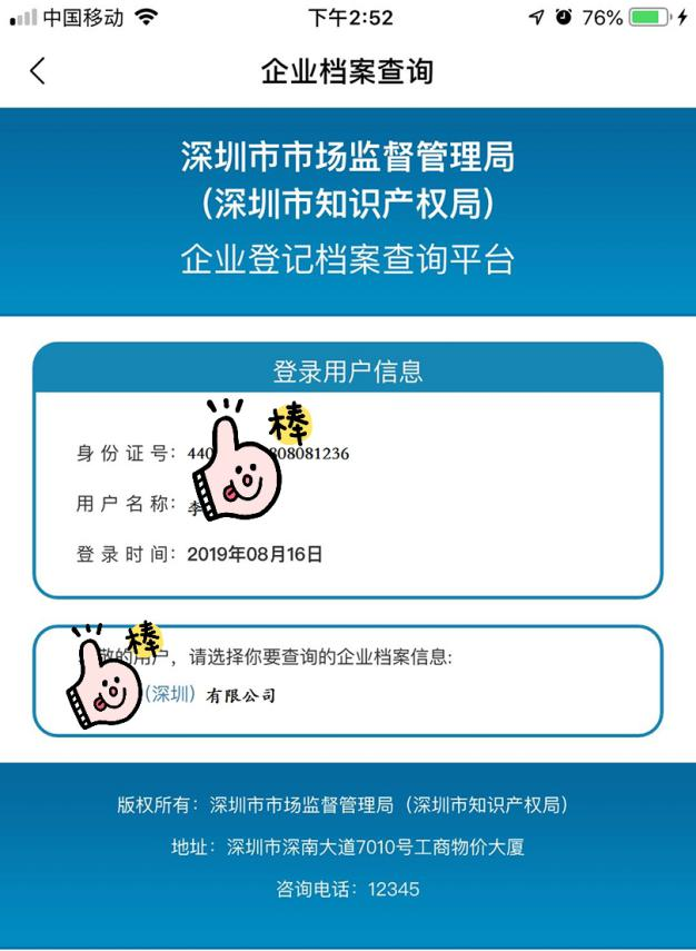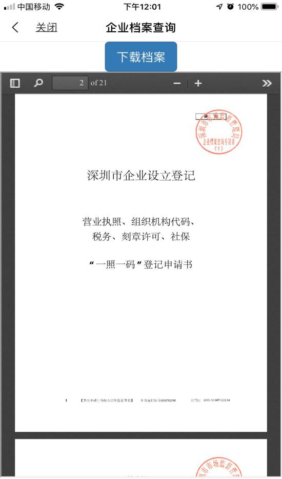 深圳企业的自然人股东或法定代表人可以直接在手机上浏览本企业的登记档案信息,点击“下载档案”即生成该档案的防伪码,可凭防伪码在深圳市市场监督管理局门户网站(//amr.tanhuaxl.net)下载打印相应的档案复制件。无论手机查询或网站下载的档案复制件,均与线下查询窗口现场打印的为统一规格、统一标准、统一自动嵌套印章,具有同等效力,防伪码还提供20天的网上真伪复核服务。