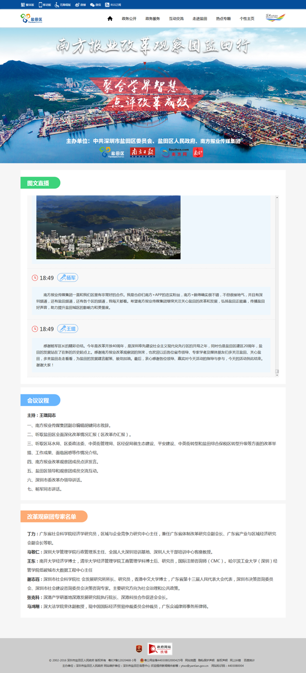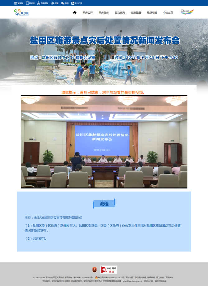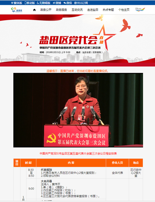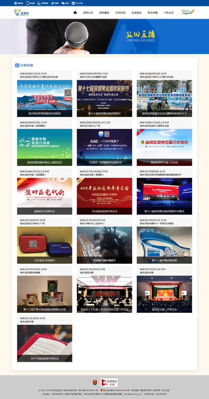 深圳盐田政府在线网站在开设直播平台以来,已经组织开展了盐田区党代会、人大会议、政协会议等政府重要会议的直播活动,第一时间直播发布区委工作报告、区政府工作报告等重要政务信息,让群众了解政府部门做了什么、正在做什么、将要做什么, 让群众实时、准确、高效的获取到第一手政务信息。