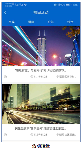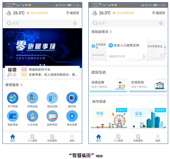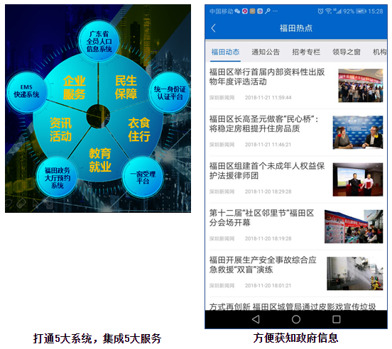 “智慧福田”APP可提供对周边信息、办事窗口和政务资讯的精准推送,周边活动最先知道,政府政策最快知晓,办事窗口地址、联系方式随时掌握。APP通过梳理管理和服务节点,依托政府大数据,按照人、法人生命周期建立24小时在线节点服务,如针对不同人群,通过系统智能分析和用户特征,定义用户最需要的资讯信息,构建一个只属于自己的服务平台,每个人收到的推荐服务、推送信息都不相同。