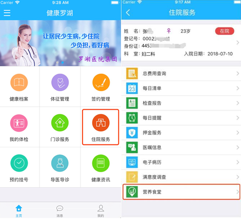 食品卫生、食品安全是全民关注的焦点,对住院患者更为重要,为解决住院患者及其陪护人员订餐、用餐问题,更是为给患者提供安全、卫生、新鲜的餐饮,罗湖医院集团在“健康罗湖”APP上推出智慧餐饮功能(如图四所示)。住院患者及其陪护人员可通过手机扫描床头二维码或通过健康罗湖APP自助订餐,针对糖尿病、高血压等有特殊用餐需求的患者提供相应的低糖、低盐等营养餐,订餐支持微信、支付宝支付,且可以在线查询订单详情及消费明细,订餐记录可追溯,而订餐配送模式解决了患者及其陪护人员活动范围及时间受限的问题,提升患者满意度。