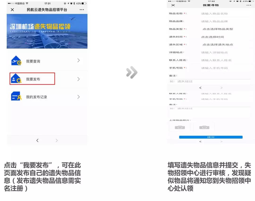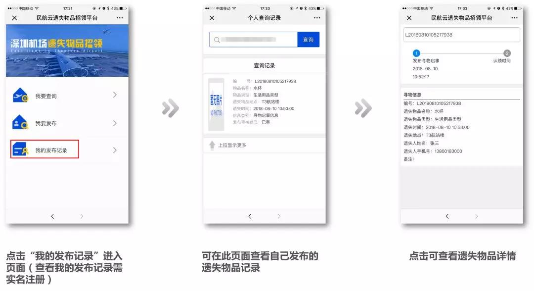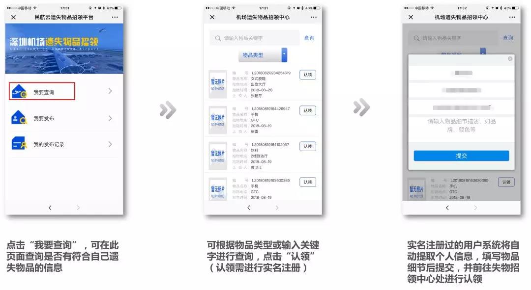 会上还发布了“遗失物品招领平台”。近年来,深圳机场同时存在机场、深航及南航3家遗失物品招领平台,且各自的系统独立,存在信息壁垒。以2017年为例,深圳机场共受理失物5.2万宗,领回2.1万宗,找回率仅为39.9%。为进一步提升乘客“幸福感、获得感、安全感”,深圳机场公安成功研发遗失物品招领平台,打破了信息壁垒、整合了三家平台资源,实现拾物者随时可报,失物者随时可查,最大限度的提升了失物找回率。
