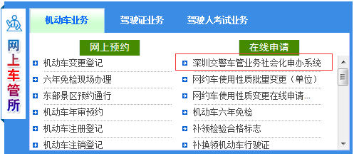 (图:网上深圳交警“深圳交警车管业务社会化申办系统”入口)