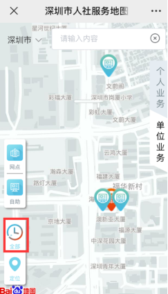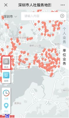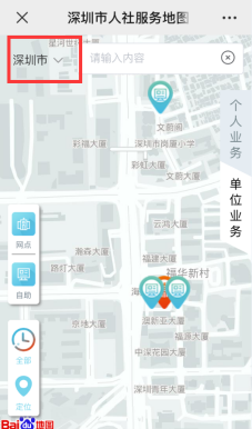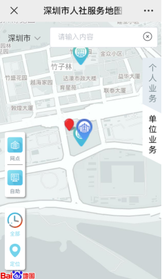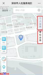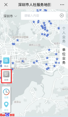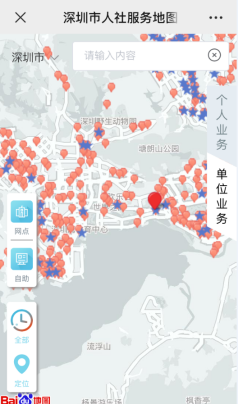 搜索“深圳人社”,进入后选择“互动”-“人社服务地图”。