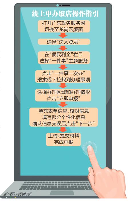 现场,该工作人员向记者演示了操作步骤,以“我要开饭店”主题为例,打开广东政务服务网后,切换至龙岗区版面并点击登录;选择“法人登录”,输入账号密码等信息后点击“登录”;在“便民利企”栏目选择“一件事”主题服务;进入“一件事”主题服务专区,点击“一件事一次办”,搜索或下拉找到“我要开饭店”;进入“我要开饭店”申办页面,选择办理区域和办理情形,点击“立即申报”;在此页面系统将自动填充表单信息,只需核对信息是否正确,填写部分个性化信息,然后点击“下一步”。特别提醒的是,在此页面,多个表单并列展示,办事群众可同时申办并列的事项,确认信息无误后点击“下一步”;最后,上传材料,系统将自动带出办事群众的电子证照等相关材料,附件上传完毕后点击“提交”即可完成申报。