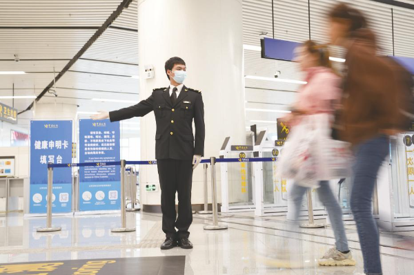 深圳边检总站移民管理警察引导侯检旅客,保障口岸通关顺畅有序。