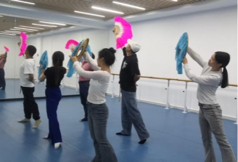 专业老师带领进行带道具整个山歌的打磨,站位调整,表现力提升提炼,经过不断的创作思维碰撞交流,穿插表演过程与观众互动点睛,专业老师与学员舞蹈授课交流,剧目不断精益求精。