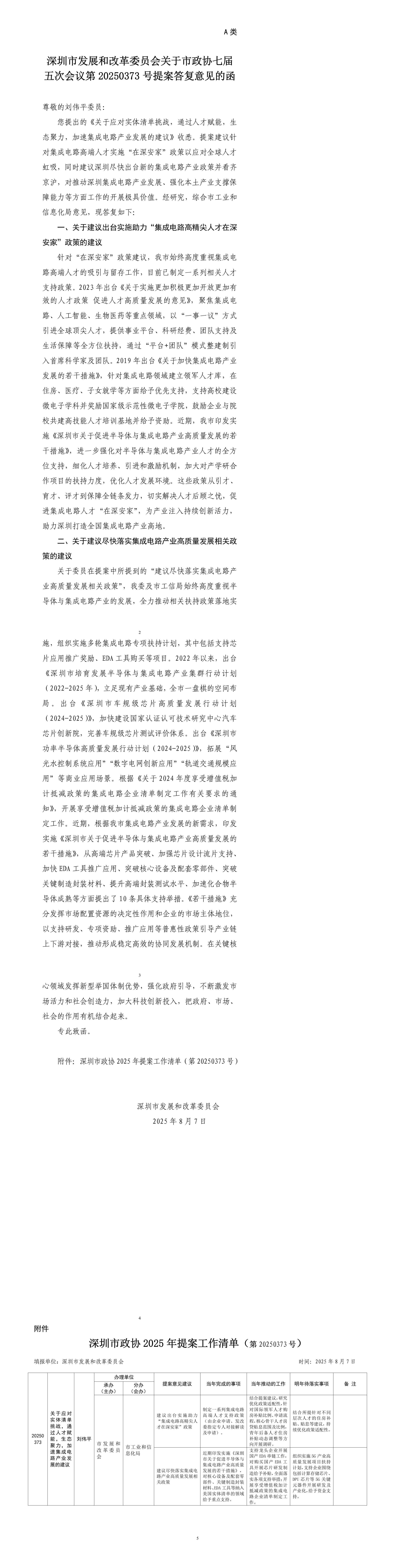 深圳市发展和改革委员会关于市政协七届五次会议第20250373号提案答复意见的函