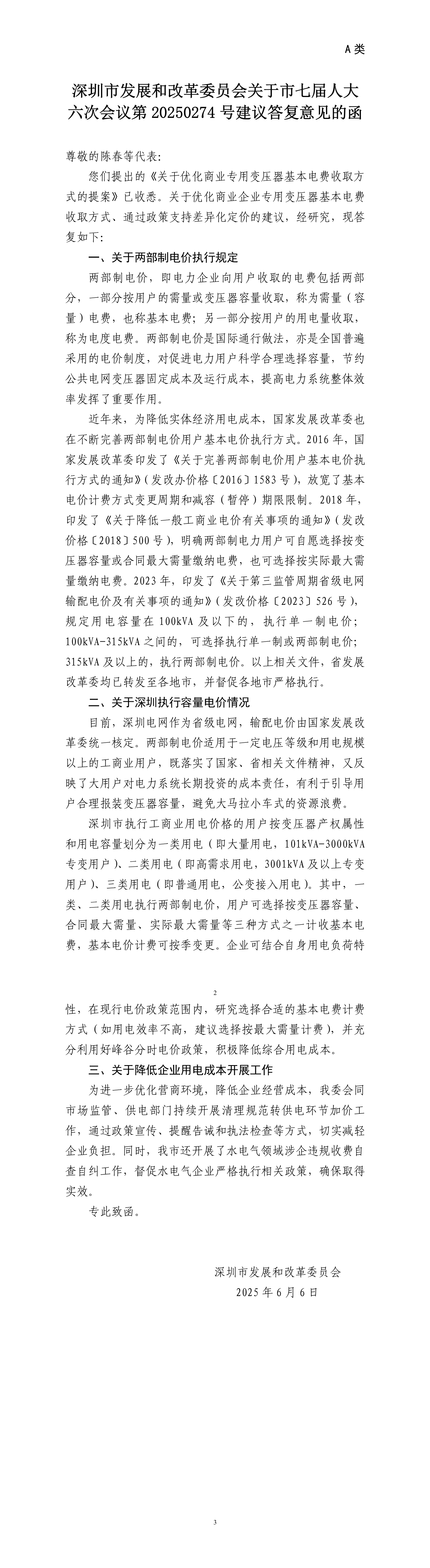 深圳市发展和改革委员会关于市七届人大六次会议第20250274号建议答复意见的函