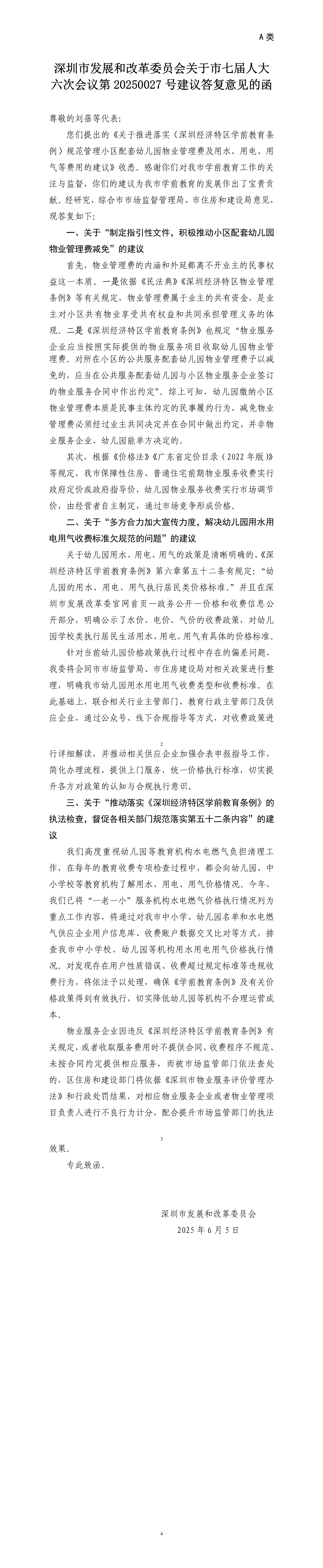 深圳市发展和改革委员会关于市七届人大六次会议第20250027号建议答复意见的函