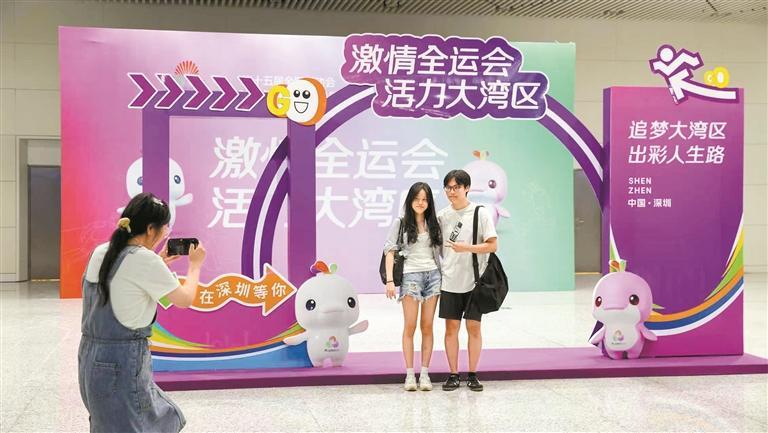 深圳喜迎十五运会氛围浓烈。图为市民在福田站十五运会主题打卡点合影。