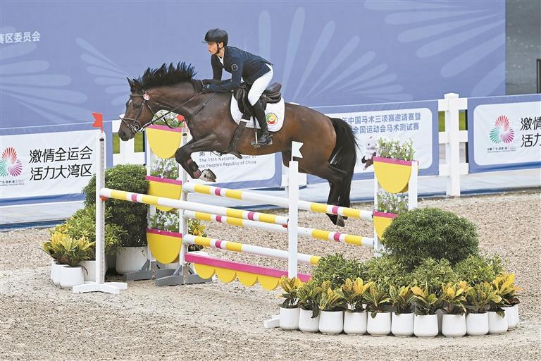 近日,十五运会马术项目测试赛在光明区举行。作为正式比赛前的重要演练,本次测试赛全面检验了场地设施与赛事组织流程。图为比赛中的马术场地障碍赛环节。
