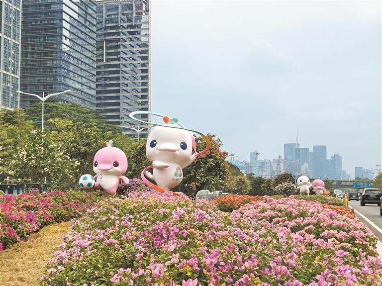 多种运动造型的十五运会吉祥物,亮相花团锦簇的深南大道绿化带。