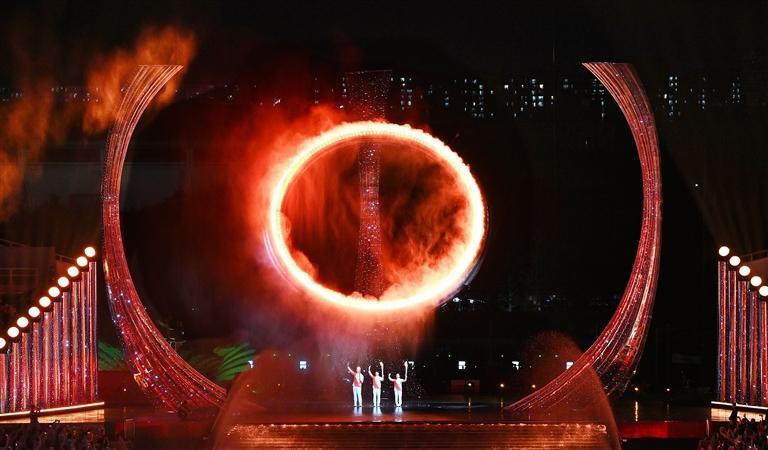 以《圆梦未来》为主题的文体展演拉开序幕。整个演出由“同根同源”“同心同缘”“同梦同圆”3个篇章组成,创新运用体育元素、艺术手段和前沿科技,生动诠释了本届全运会“激情全运会,活力大湾区”的主题。