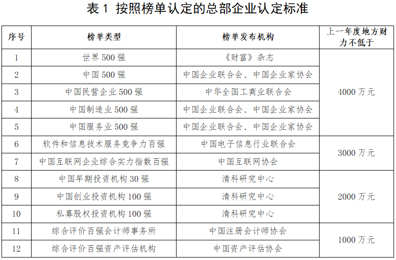 《实施意见》共涉及12类榜单,每个榜单类型、榜单发布机构、上一年度地方财力要求如下表所示。申报企业主体入选其中一类榜单(以最新公布的榜单为准)并符合相关条件即可申请认定为我市总部企业。