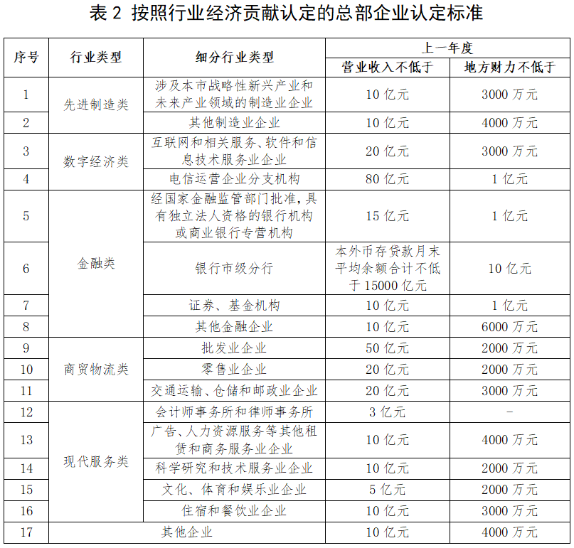 《实施意见》中,共分为6大类、17个小类,每个小类上一年营业收入要求(银行市级分行的考核指标为本外币存贷款月末平均余额)、地方财力要求如下表所示。符合其中一个行业类型的条件即可申请认定为我市总部企业。