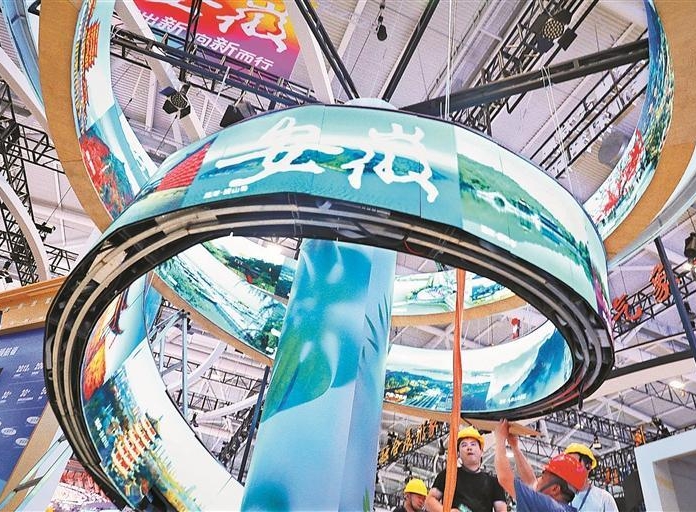 5月21日上午,深圳国际会展中心,工人正在安装巨型环状LED屏。 作为我国唯一国家级、国际化、综合性的文化产业博览交易会,第二十一届中国(深圳)国际文化产业博览交易会(以下简...